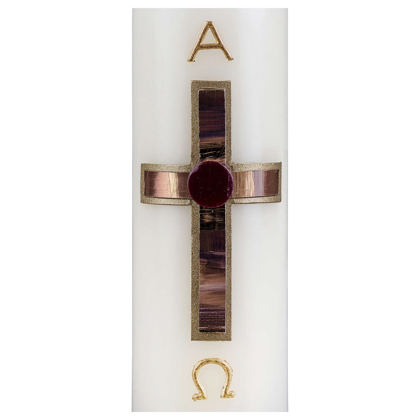 Candela decorata da una croce marrone con sfumature oro, con Alfa e Omega in lettere dorate.
