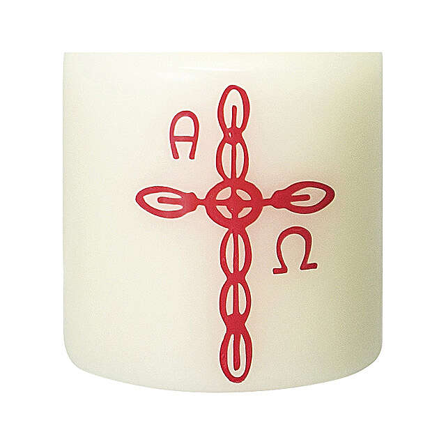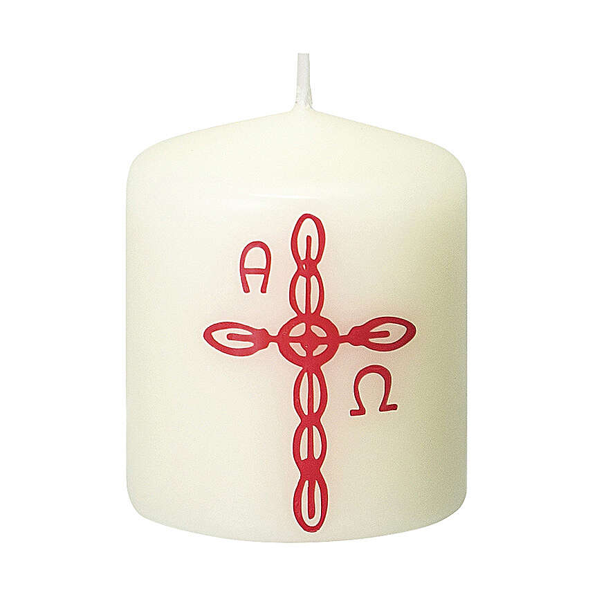 Candela di altezza 6 cm e diametro 5 cm, decorata da una croce rossa ornata e simboli Alfa e Omega.