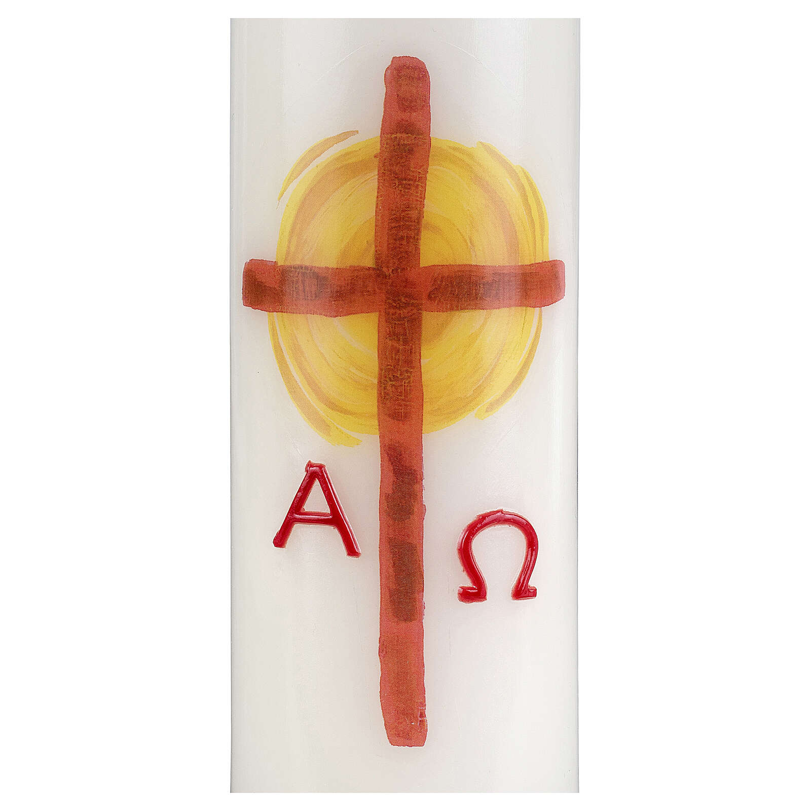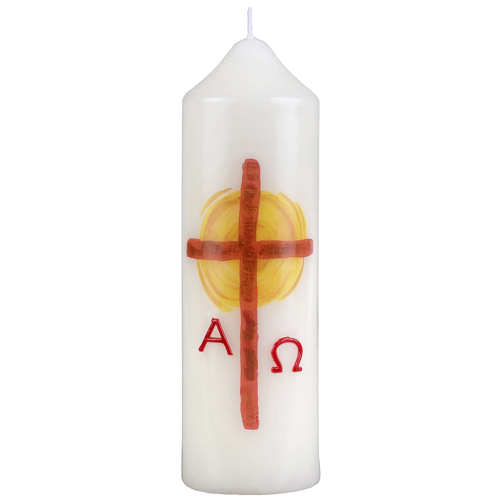 Candela in cera bianca con decoro a forma di croce rossa con sole sullo sfondo all'incrocio dei bracci.