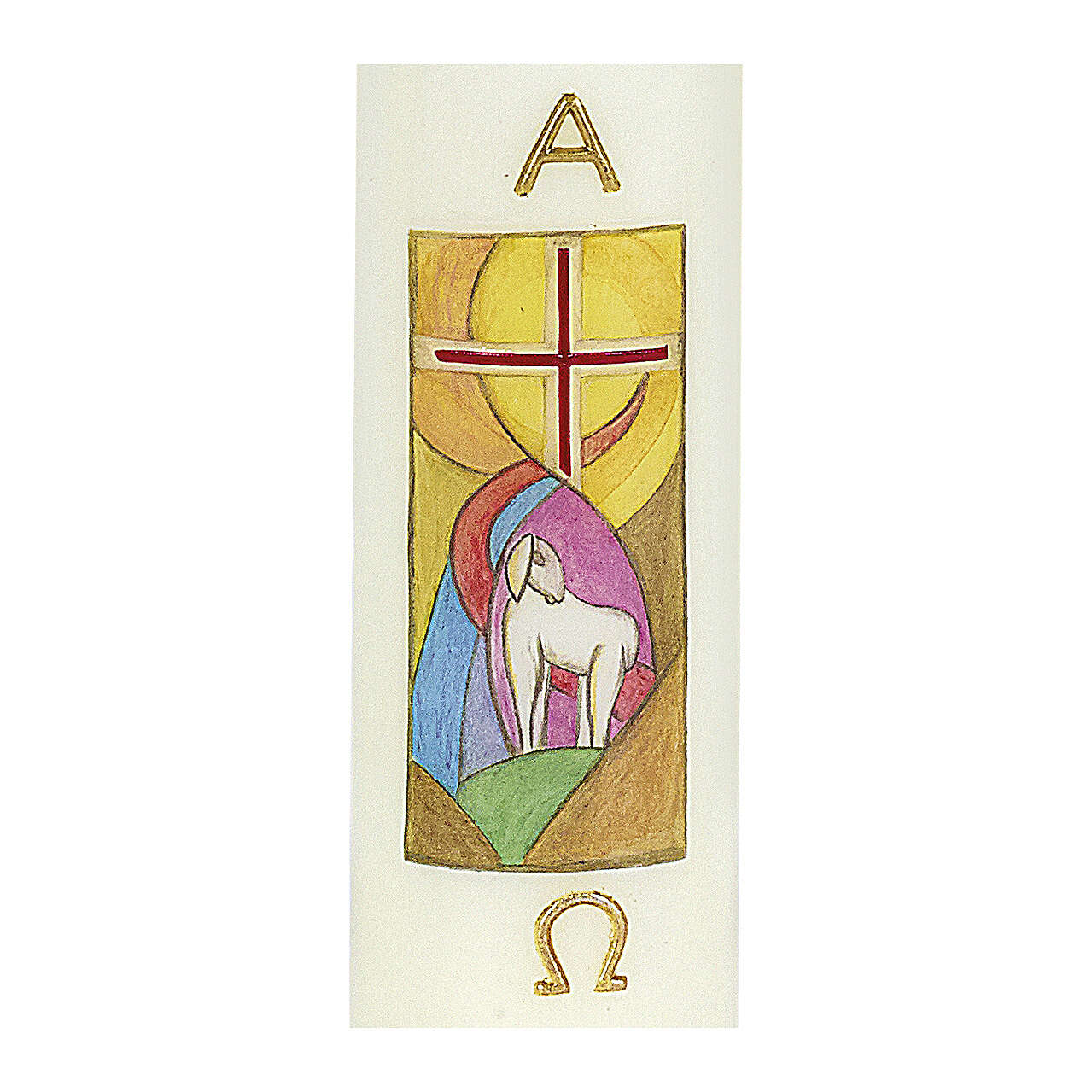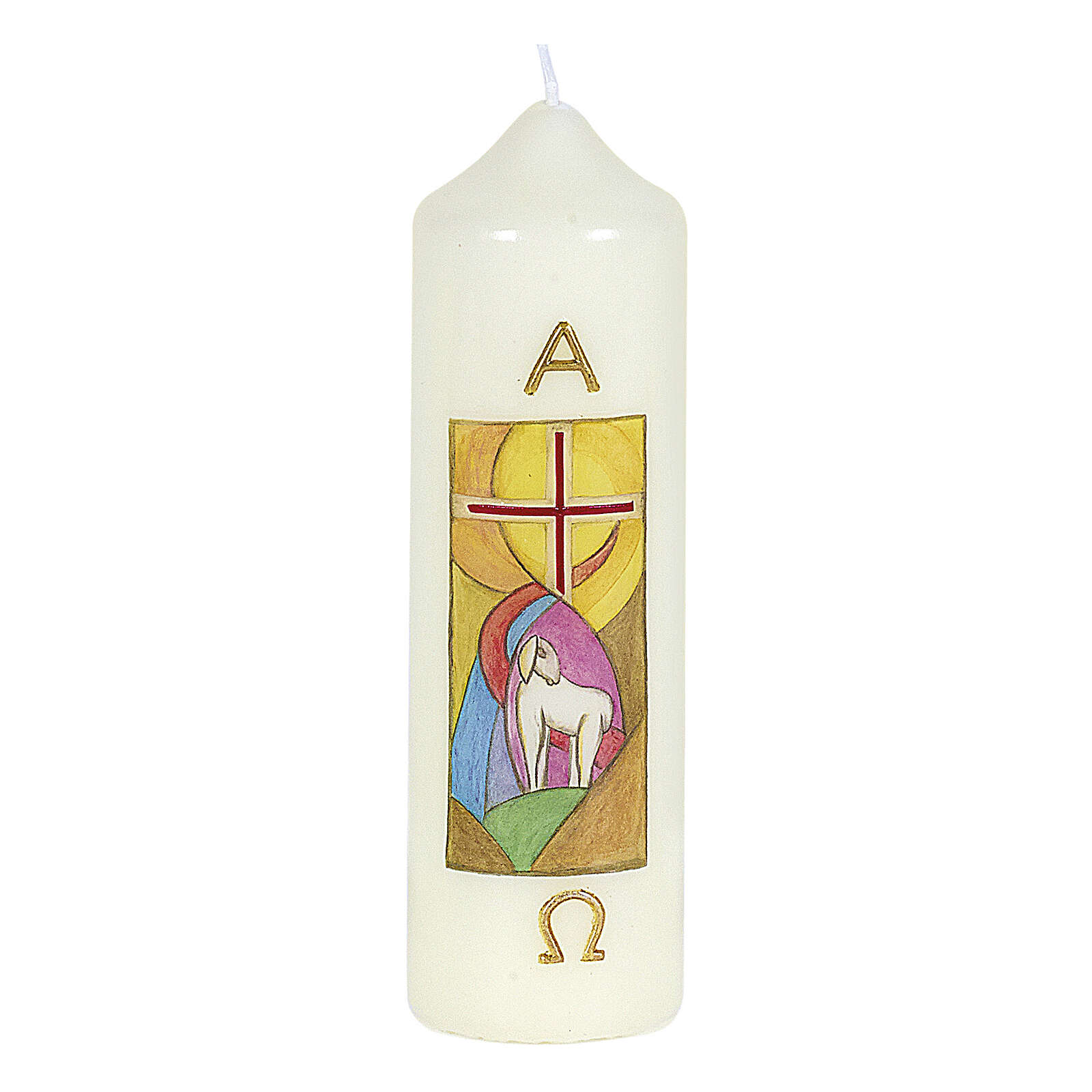 Candela in cera bianca, decorata sul fronte da un disegno stilizzato raffigurante un agnello bianco su sfondo colorato. Sopra l'agnello si trova una croce rossa e oro. La candela è poi decorata da lettere dorate Alfa e Omega.