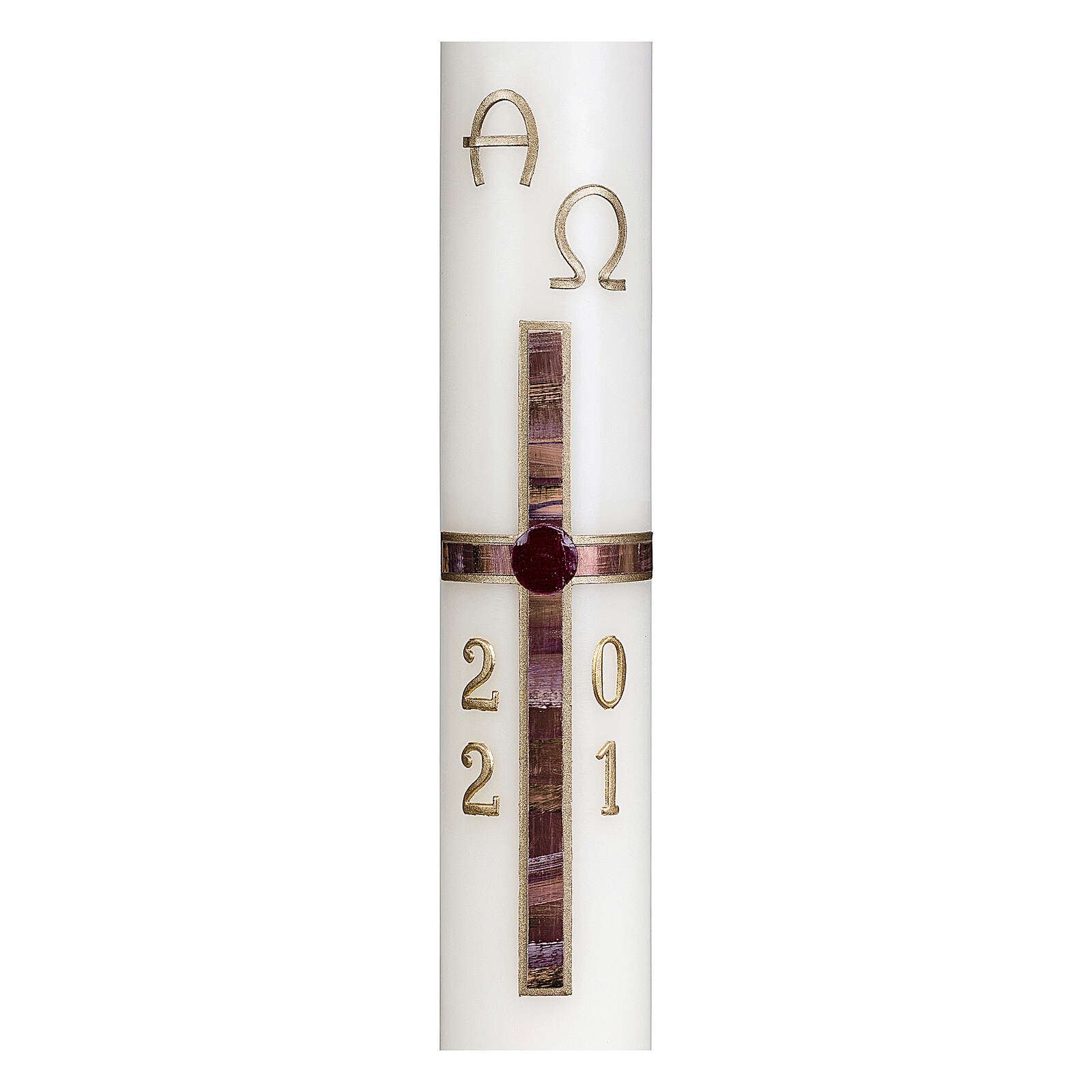 Candela pasquale bianca, composta al 10% da cera d'api. Questo cero è caratterizzato dal decoro, ossia una croce marrone con striature oro, il simbolo Alfa e Omega e l'anno corrente.