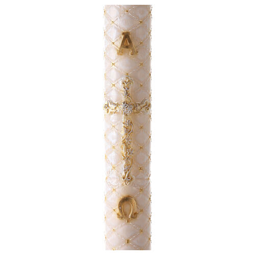 Il Cero Pasquale è realizzato in cera di paraffina, di alta qualità. Questo materiale permette al Cero di mantenersi solido durante le alte temperature estive. Il Cero è poi dipinto a mano da artigiani esperti del settore, per aver una maggior precisione. Il Cero è decorato dalle lettere Alfa e Omega e una croce dorata, il tutto contornato da uno sfondo matelassè.