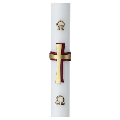 Cero pasquale in cera bianca, 90 cm di altezza e 8 cm di diametro, decorata con una croce centrale in rilievo dai colori oro e rosso, con finitura opaca e contrasto visivo.