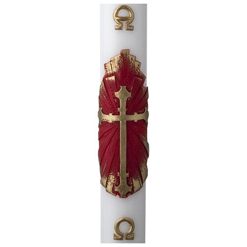 Questo cero pasquale è realizzato in cera bianca con decoro in rilievo di croce antica dorata su fondo rosso e oro, assieme alle lettere Alfa e Omega poste sopra e sotto il rilievo decorato.
