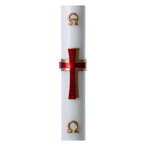 Cero pasquale in cera bianca con Croce rilievo rossa, di dimensioni 8x120 cm.