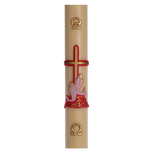 Cero pasquale in cera d'api con croce e pesci rossa, dimensioni 8x120 cm.