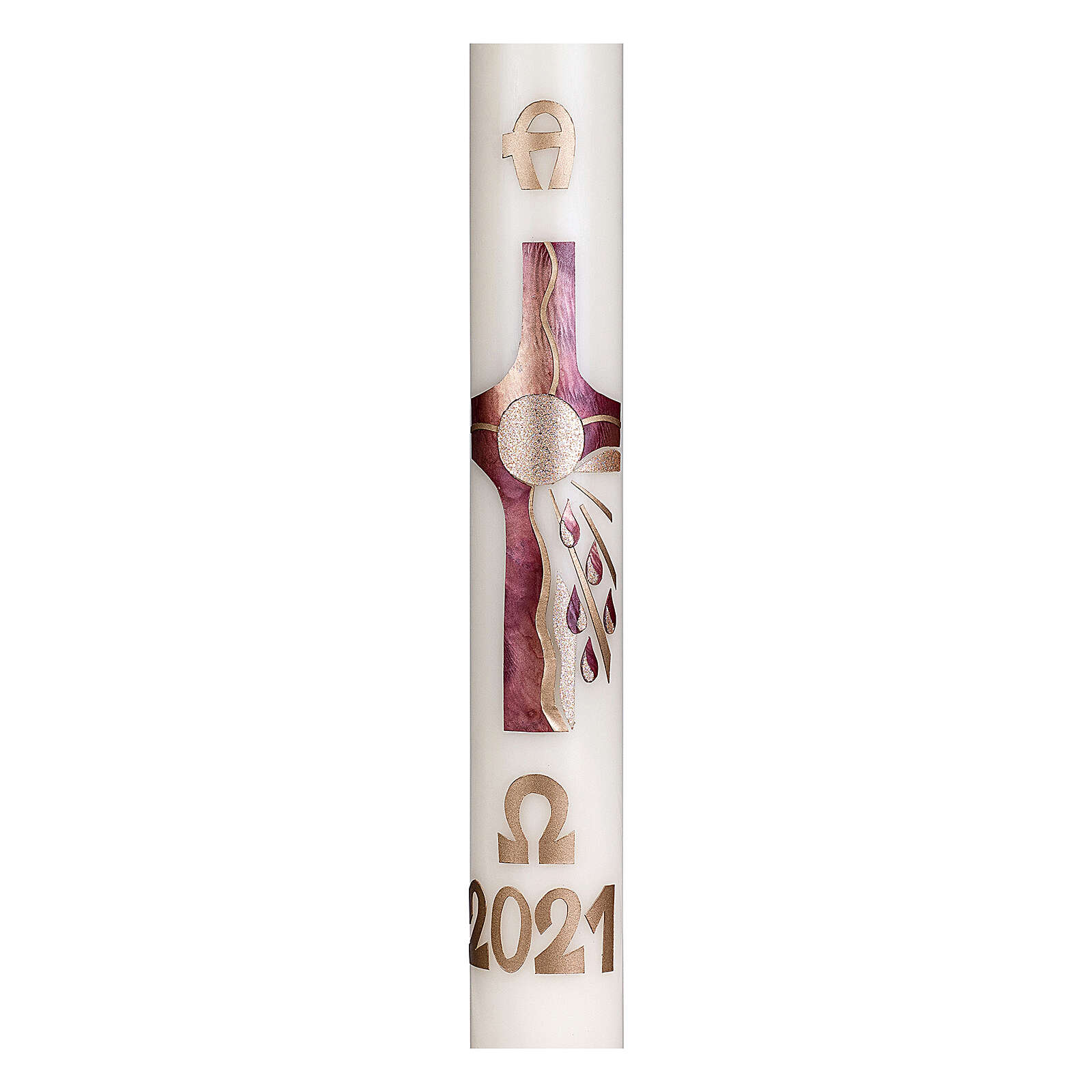 Questo cero presenta sul fronte i simboli Alfa e Omega, l'anno corrente e una croce rossa e dorata coi simboli dell'Ultima Cena. Si vede infatti al centro un disco dorato raffigurante il pane e delle gocce di vino, rappresentanti il sangue di Cristo.