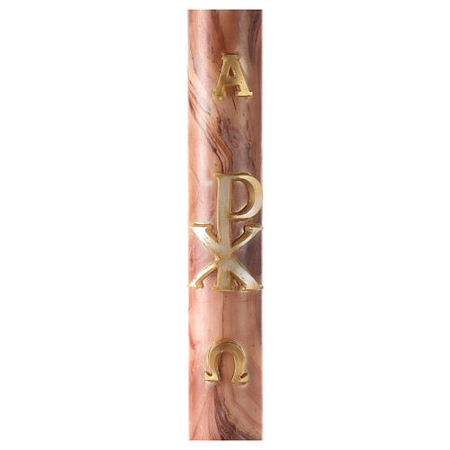 Il Cero Pasquale è realizzato in cera di paraffina, l'alta qualità di questo materiale permette al cero di rimanere solido durante le temperature estive. Il Cero Pasquale è decorato da uno sfondo marmorizzato con macchie bianche e dalle lettere X, P, Alfa ed Omega in rilievo.