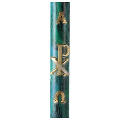 Il Cero Pasquale è realizzato da una cereria storica, ed è prodotto interamente in cera di paraffina di alta qualità. Il Cero Pasquale è decorato da uno sfondo marmorizzato verde e dalle lettere X , P, Alfa ed Omega in rilievo, che simboleggiano il Messia. Il materiale utilizzato per creare il cero è molto resistente alle temperature estive e permette al cero di mantenersi solido.