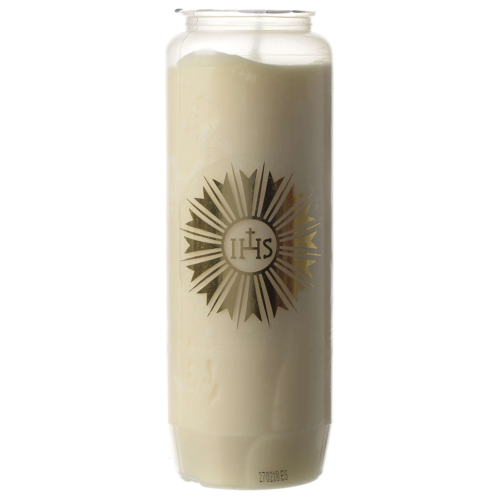 Disponibilità immediataCerone per Santissimo, lumino di colore bianco con scritta IHS della durata di 6 giorni.